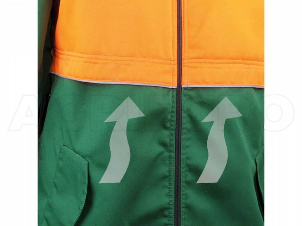 DESCRIPTION : ouverture centrale avec fermeture éclair, col renforcé avec du matériel de protection, deux larges poches sur le fond avec rabat avec scratch, bandes retro-réfléchissantes, matériel de protection sur épaules, bras et partie supérieure du thorax, poignets réglage avec scratch réglage, réglage taille avec cordon coulissant, système de ventilation antérieur et postérieur, poche interne.