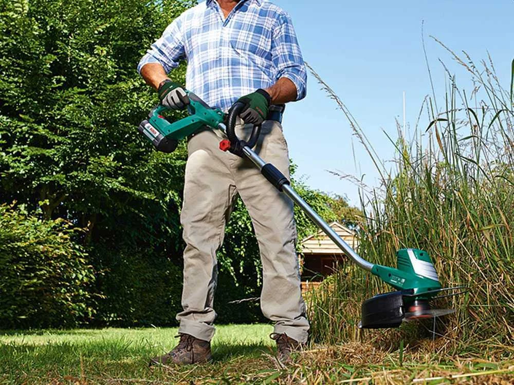 Avec un simple clic de la tête rotative, le coupe-bordures permet de couper l’herbe, de couper les bords et de faire la finition.