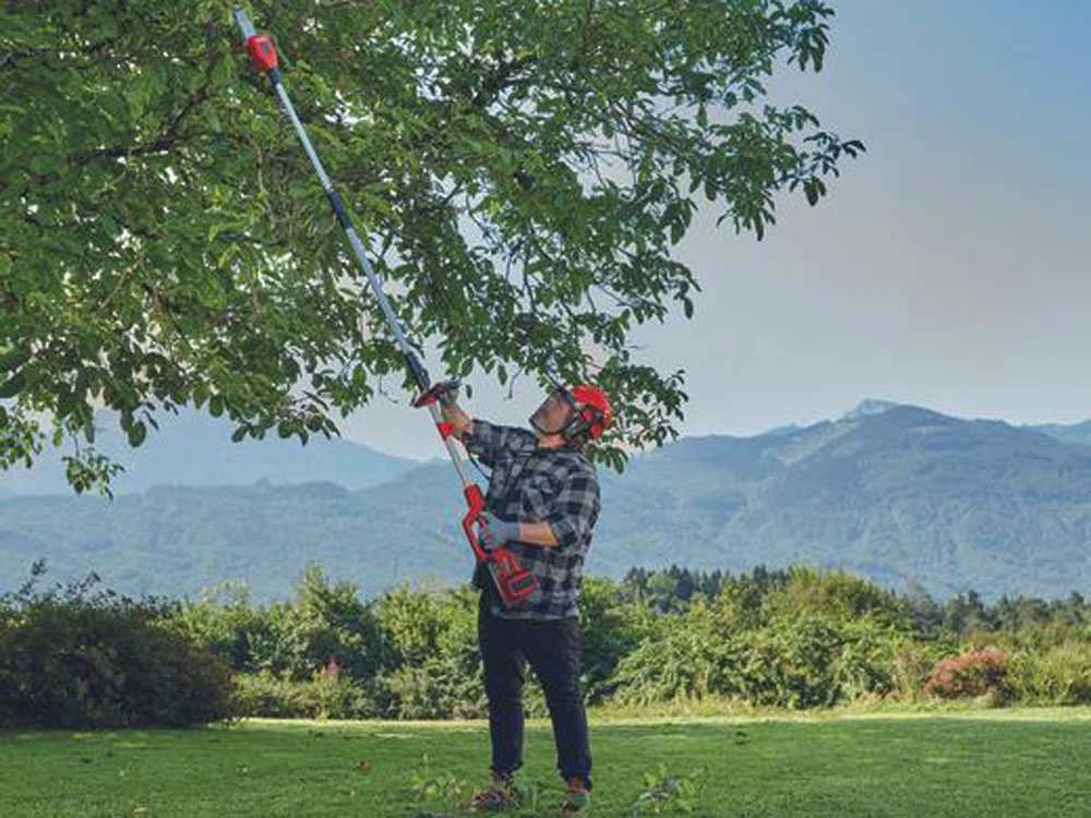 La perche de rallonge permet à l’élagueuse d’atteindre même les branches les plus hautes.