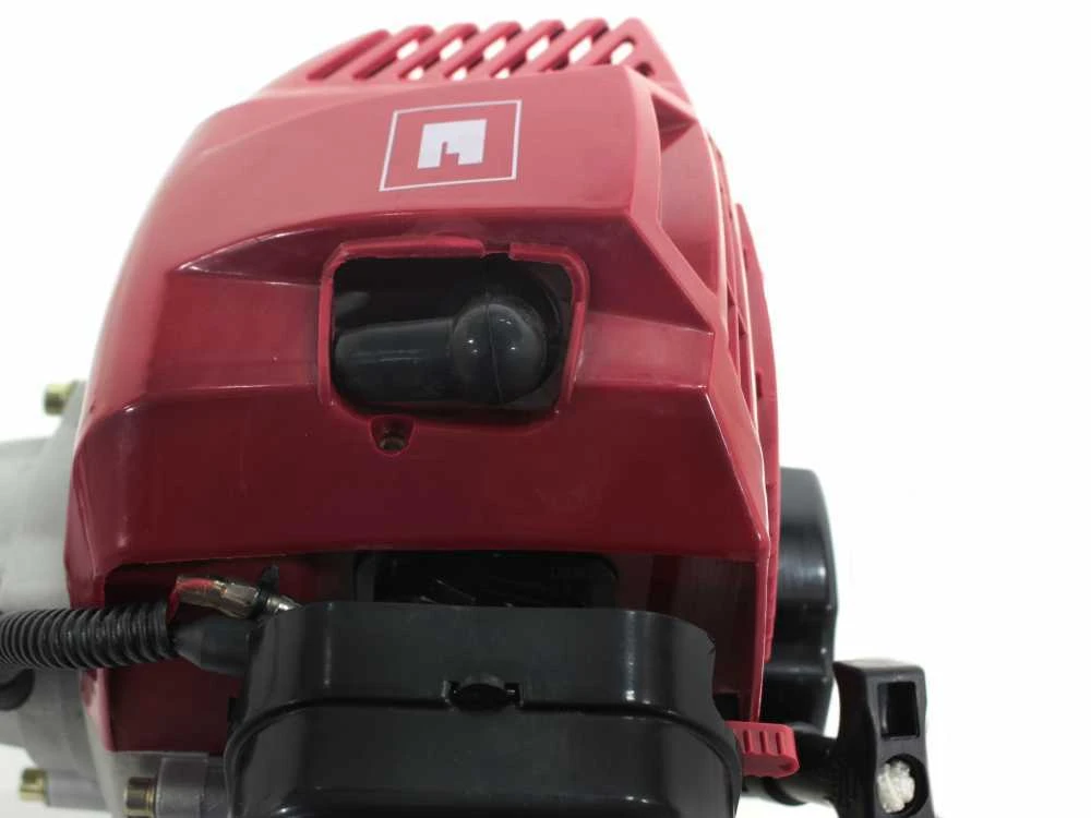 La débroussailleuse s’active très simplement grâce au système de démarrage manuel par tirage avec ressort de rembobinage, à la pompe d’amorçage d’activation à froid (starter) et au réglage de l’air.