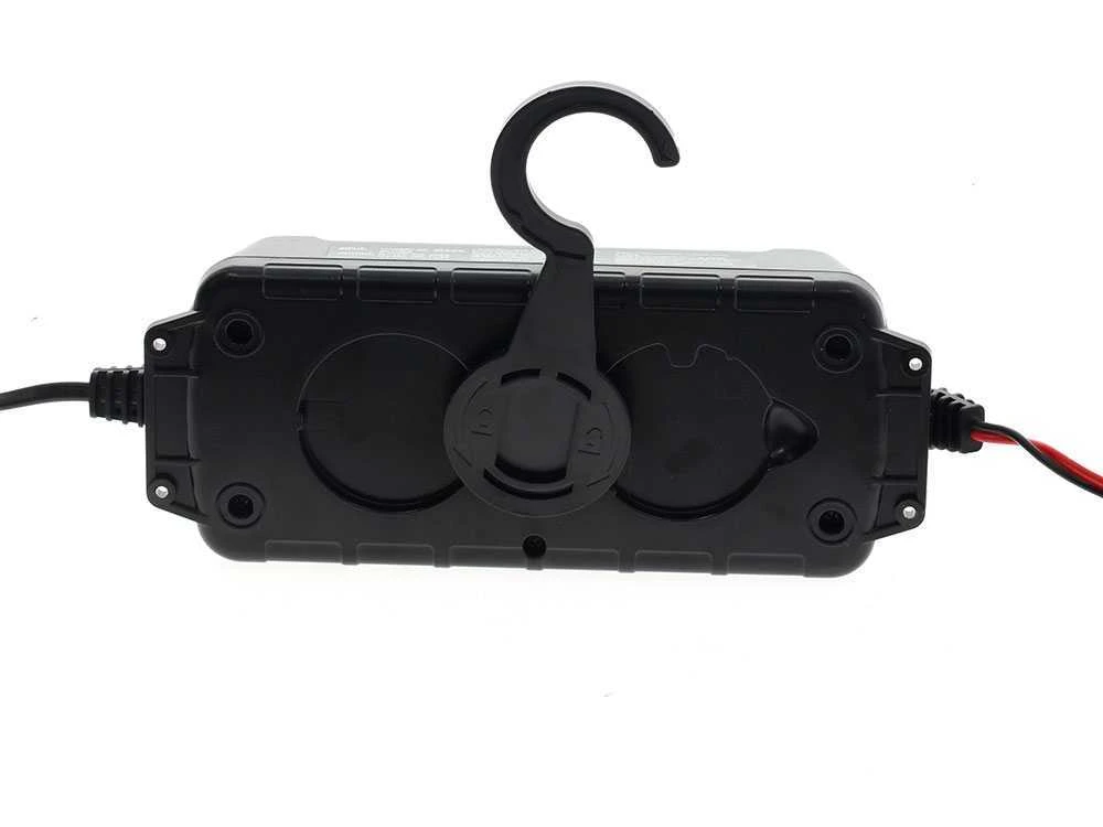 Ce petit chargeur de batterie auto permet l’utilisation à l’extérieur grâce au niveau de protection IP65 et le crochet rabattable.