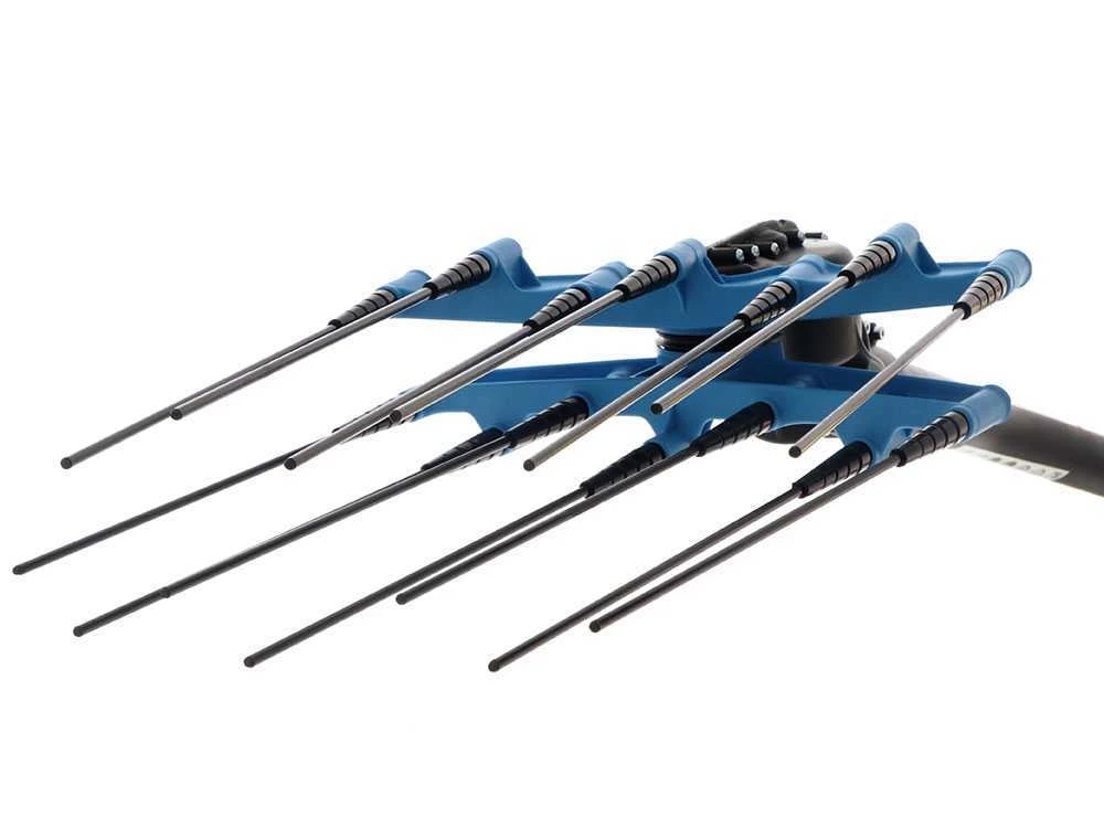 La meilleure pénétration en profondeur sur le marché, grâce à ses très longues pointes, de pas moins de 30 cm. Il gaule jusqu’à une profondeur notable. Toutes ces caractéristiques le rend particulièrement adapté pour travailler sur des oliviers très touffus et/ou peu taillés. Il n’endommage pas les olives et ne provoque pas de rupture ou dégâts des branches. Le système de fixation des pointes, avec écrou, est étudié pour permettre le remplacement de la pointe rapidement.