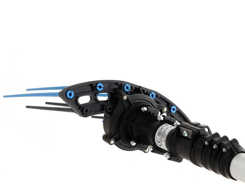La tête de ce peigne vibreur se compose uniquement de la transmission et du support pour les pointes. Le moteur est placé au bout de la perche pour un meilleur équilibre des poids.