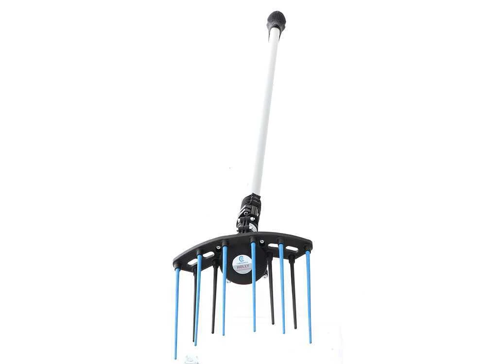 Moteur au bout de la perche pour un meilleur équilibre, poignée anti-dérapante pour le câble, pointes flexibles pour ne pas blesser l’arbre, basse absorption et légèreté, il s’agit seulement de quelques-unes des qualités que présente ce peigne vibreur Holly Campagnola.