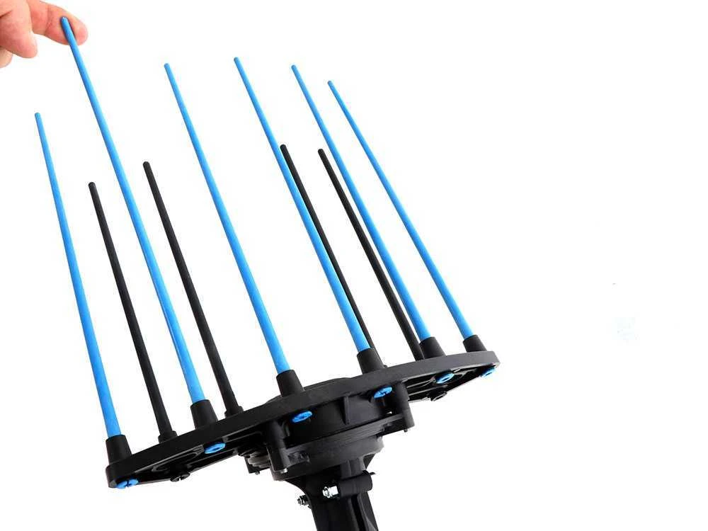 Il possède 10 pointes mesurant 25 cm (couleur bleue) et 20 cm (couleur noire). Le choix de ces deux mesures différentes assure un meilleur rendement au moment de la récolte et de la pénétration dans le feuillage de l’arbre.