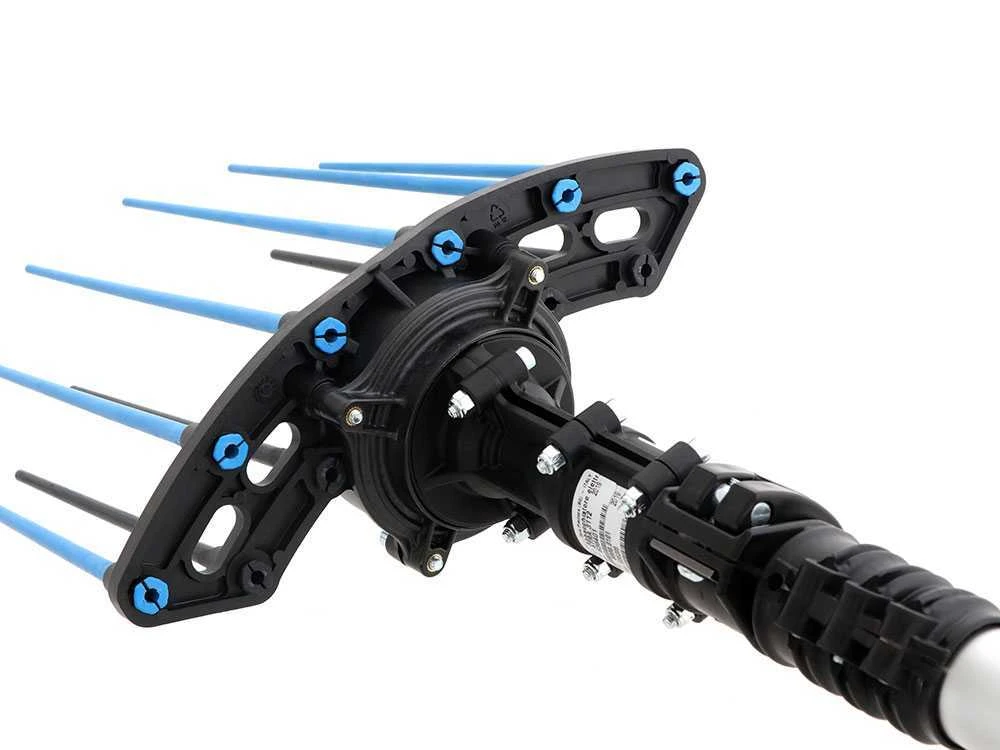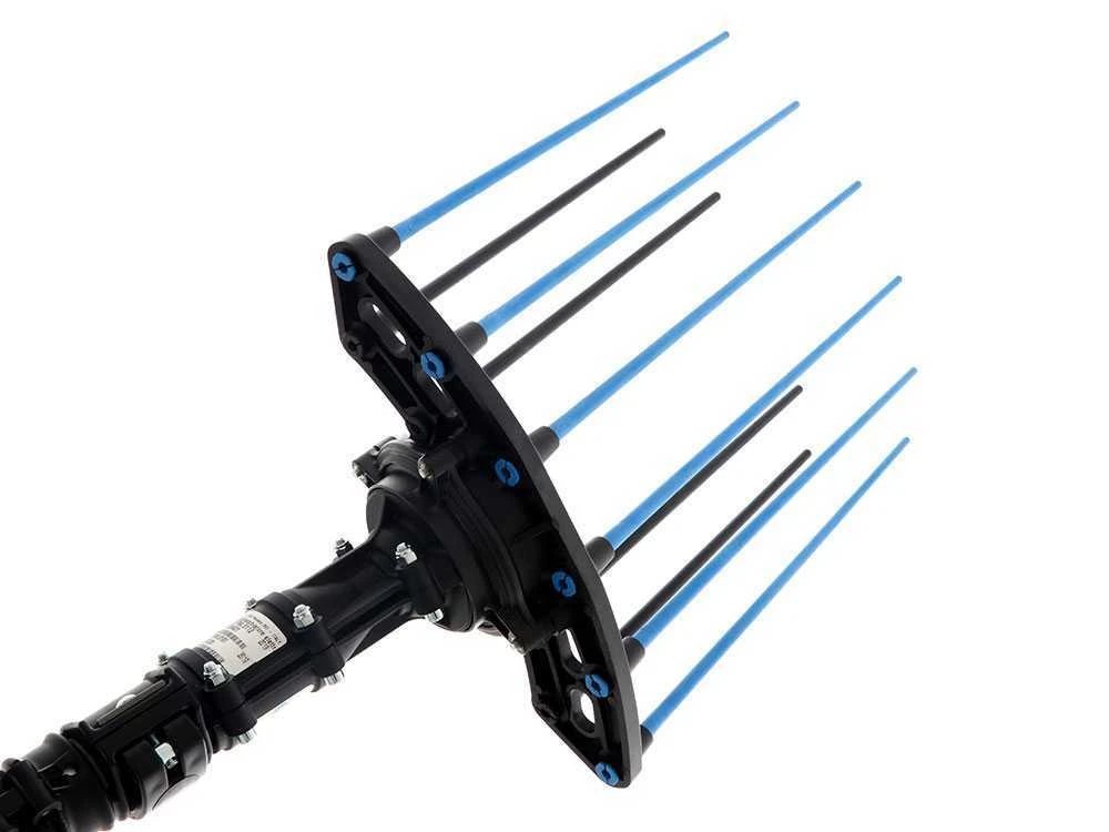 La tête de ce peigne vibreur se compose uniquement de la transmission et du support pour les pointes. Le moteur est placé au bout de la perche pour un meilleur équilibre des poids.