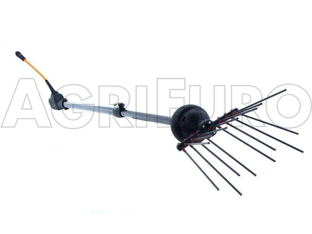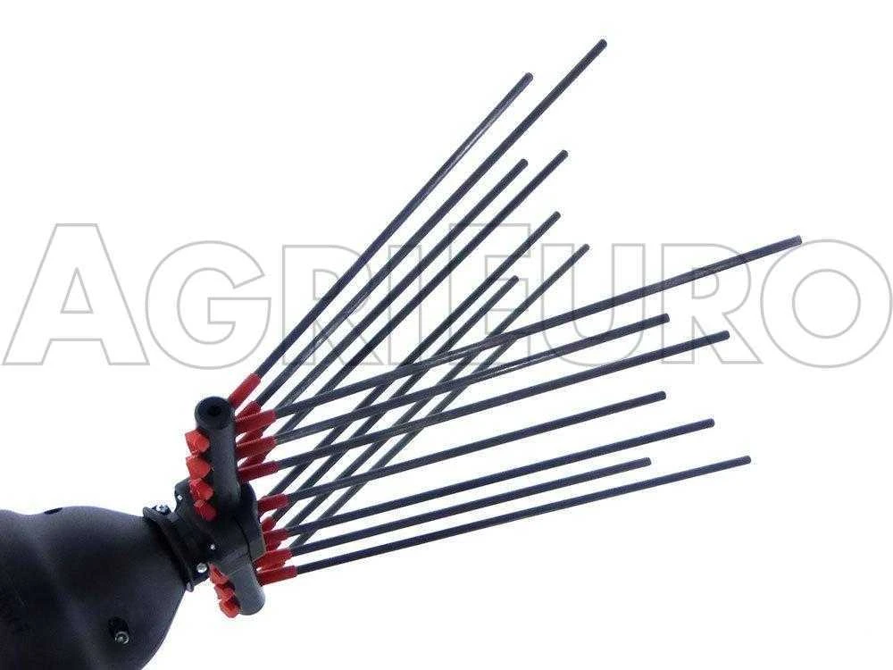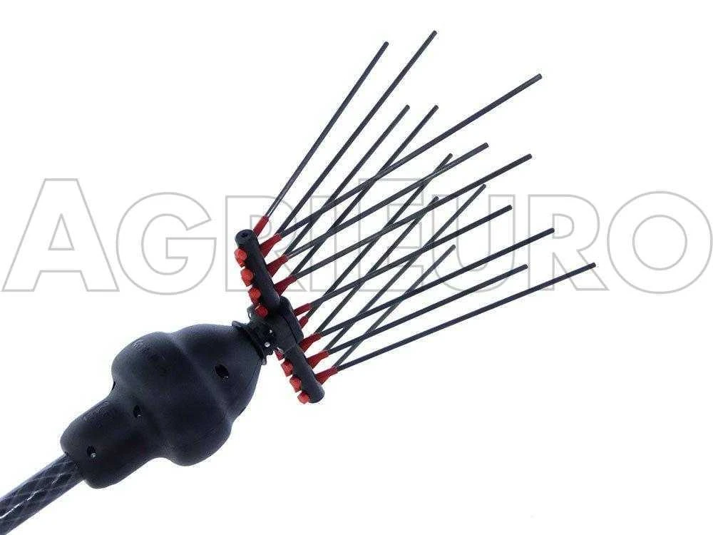 La flexibilité des pointes, réalisées en carbone à pultrusion longs jusqu’à 27 cm, réduit au minimum le contact sur les olives et sur l’olivier.