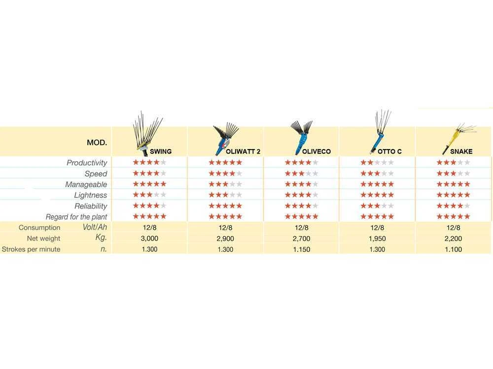 Ce modèle dispose de dents avec une forme en éventail qui reproduit le mouvement de la main, pousse les olives vers la base, et arrive à cueillir même les fruits les plus résistants.