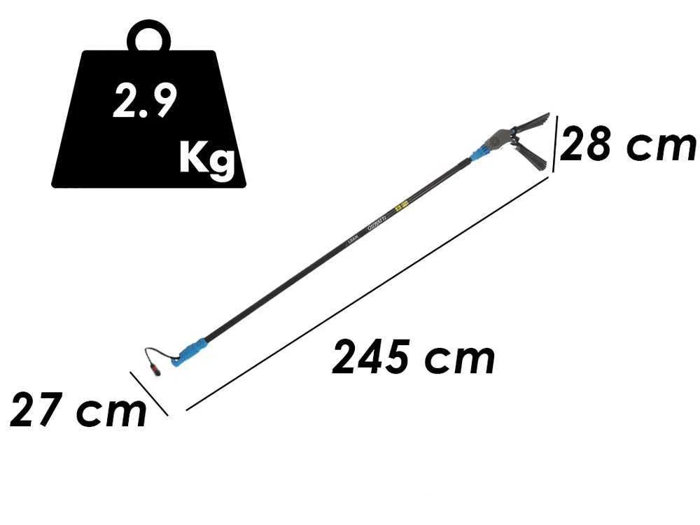 La perche de rallonge en aluminium a une excursion de longueur allant de 250 cm jusqu’à une longueur maximale de 350 cm. L’action d’extension peut être faite avec le système de crochet et de décrochage rapide.
