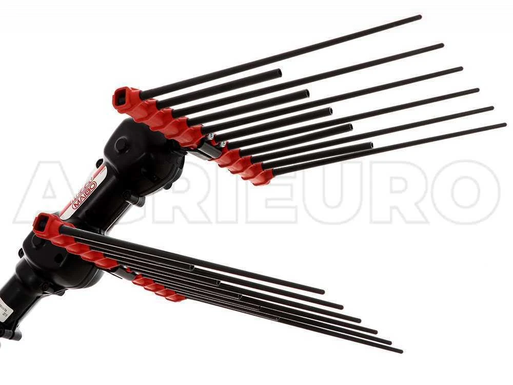 Tandis que les râteaux oscillent d’un mouvement de droite à gauche, au même moment les dents bougent dans le sens rotatif opposé, en créant une ellipse de 8 x 7 cm qui permet d’avoir un rayon de récolte plus grand. En outre, cela permet également la réduction des vibrations transmises à l’ensemble de l’outil et, par conséquent, à l’opérateur.