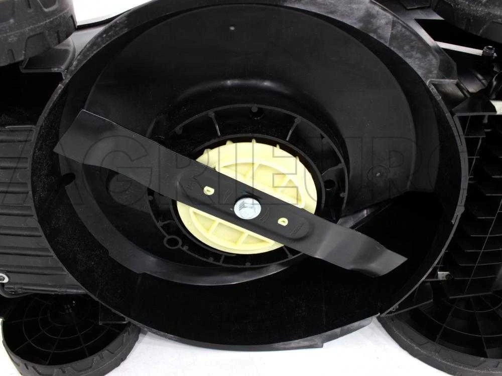 Au milieu de la zone frontale se trouve l’emplacement de la batterie Samsung de 2,5Ah, fourne avec la tondeuse.