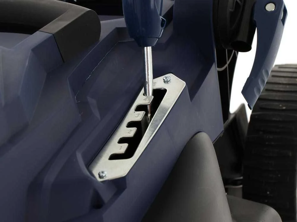5 différents réglages de coupe permettent une bonne variété de positions pour une machine de ce niveau. L’ajustement de la hauteur des roues est faisable grâce à un levier présent sur le flanc de la machine, vous pourrez obtenir jusqu’à un max de 80 mm de hauteur et un minimum de 25 mm.
