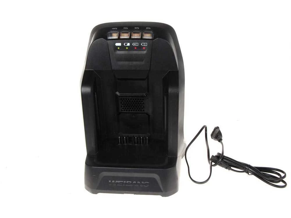 La batterie de 120V aux ions de lithium peut être rechargée à n’importe quel moment (comme les batteries de nos smartphones modernes, elle n’a pas d’effet de mémoire) pour l’avoir toujours prête à l’utilisation. Elle dure environ 30 fois plus qu’une batterie normale. La batterie est d’ailleurs dotée d’un indicateur du niveau de charge et d’un bouton d’activation pour prévenir les allumages accidentels. Le temps de charge normal est de 1/ 2 heures. En confection, le chargeur de batterie Weibang vertical rapide