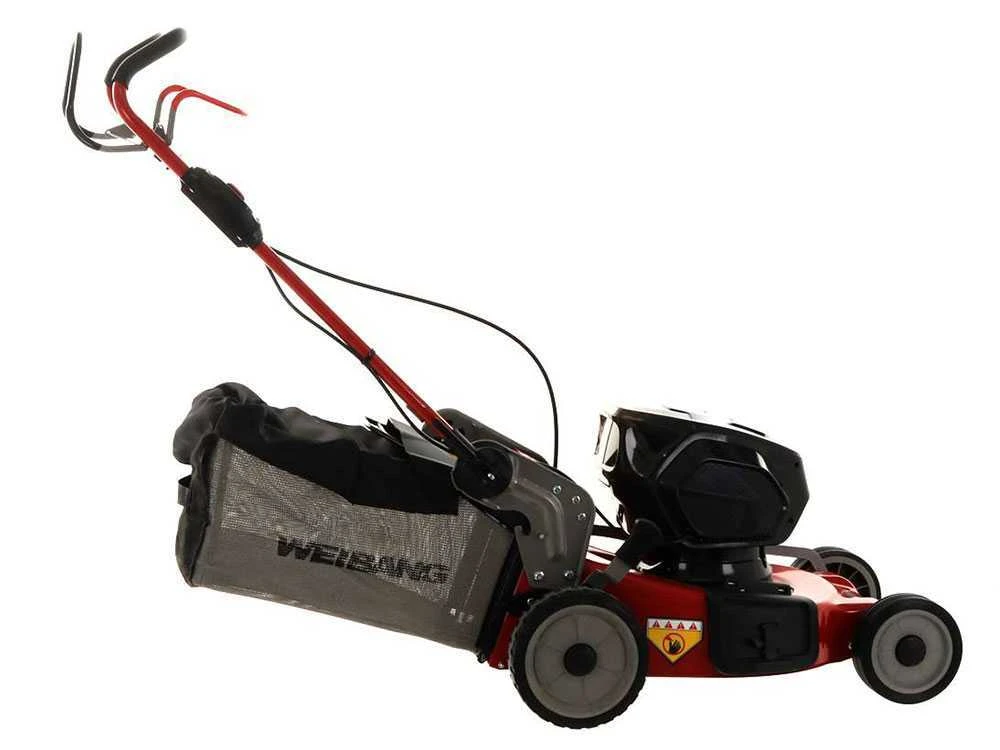 La tondeuse à gazon Weibang possède un solide châssis d’acier de 53 cm de largeur et monte une lame de coupe multifonction de 49 cm.
