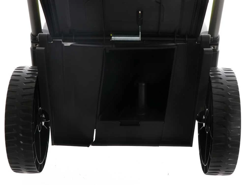 Cela permet de recueillir l’herbe dans le bac de ramassage prévu de 35 lt. Le panier est équipé d’une poignée pour son démontage.