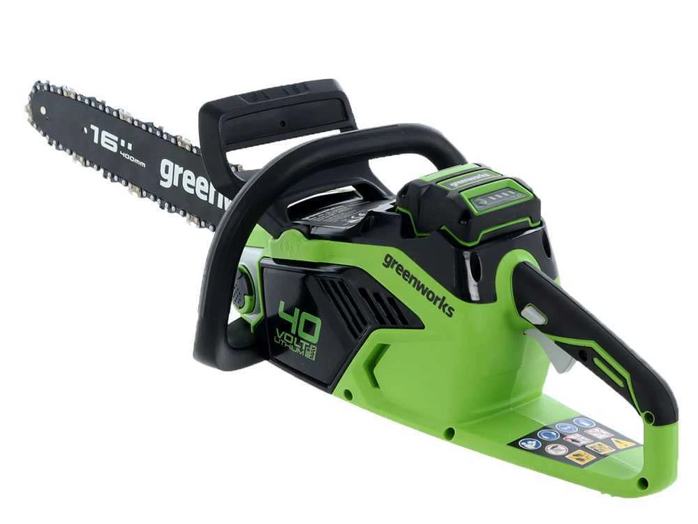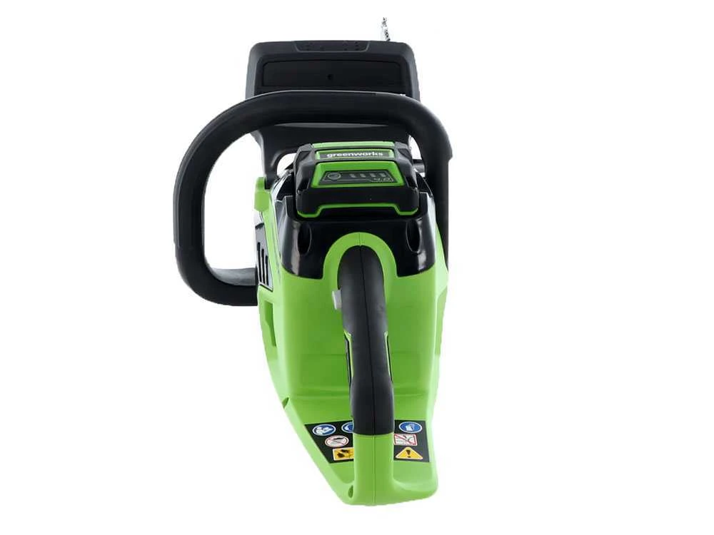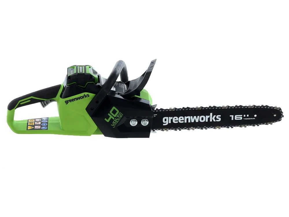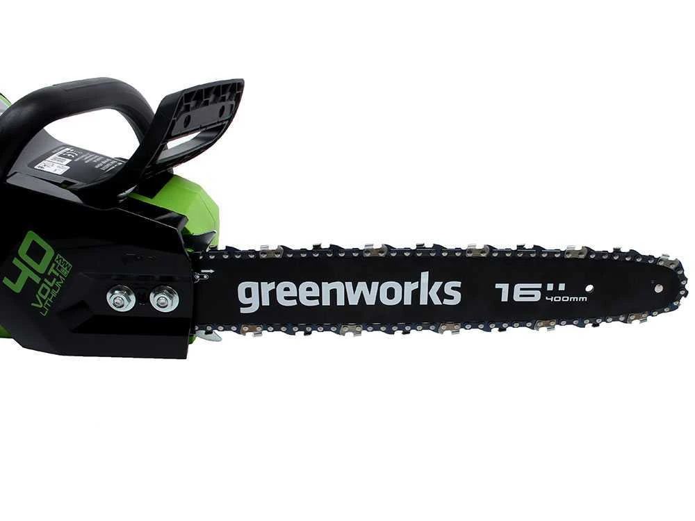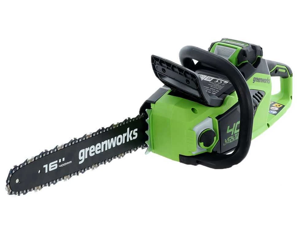 Tronçonneuse avec moteur à induction alimentée par batteries universelles 40V Greenworks, ce qui permet à cette tronçonneuse de travailler sans devoir gérer des câbles ou des carburants.