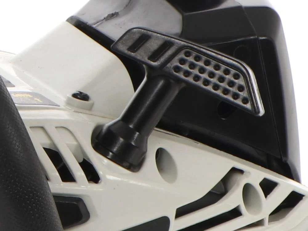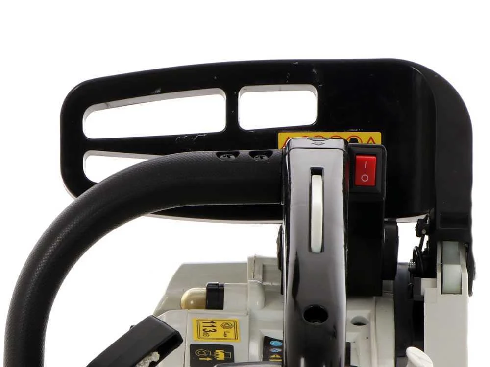 La sécurité du produit est assurée par un système de protection contre les contrecoups avec frein à chaîne instantané : lorsqu’un contrecoup est détecté, la chaîne est immédiatement arrêtée. La tronçonneuse est également équipée d’un bloc de chaîne de sécurité pour minimiser le risque de détachement soudain de la chaîne.